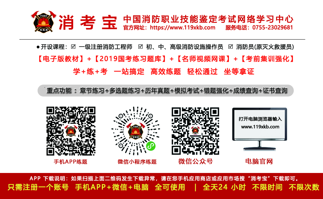 消考宝是专业的消防考试系统,有精准国考题库,全面视频讲解,名师全天辅导,免费考前集训,手机、电脑、平板都可练题,“理论+实操+视频教程”轻松搞定,助你一次通过,消考宝会员加微信岳老师18927453194,周老师13202250867 即可免费进群辅导,早练习,早过关!