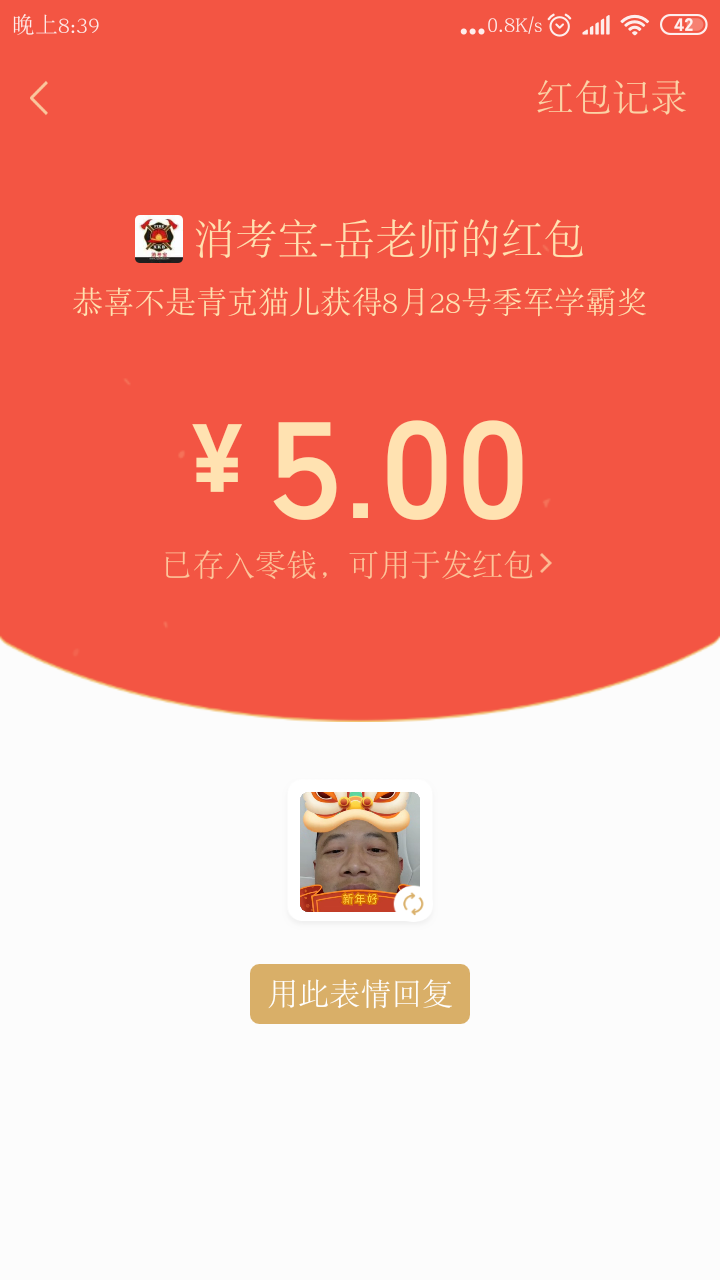 恭喜消考宝学员“不是青克猫儿”同学以100分的优异成绩获得8月28日【季军学霸】,获得5元现金红包。(加老师微信18927453194或13202250867进群备考,高效练题,还有现金红包领哦!)