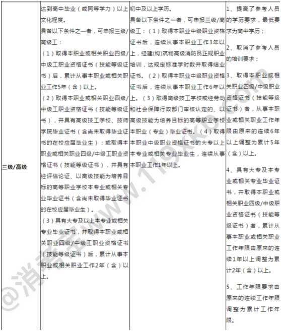 消防设施操作员(初、中、高级)报考条件新旧标准比较