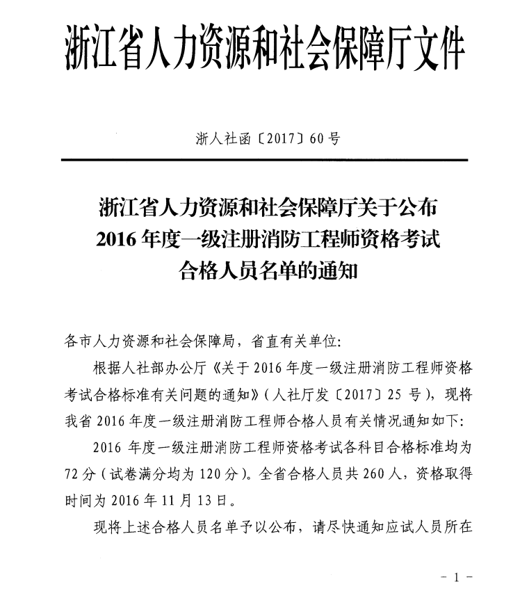 2016年度一级注册消防工程师资格考试浙江260人合格