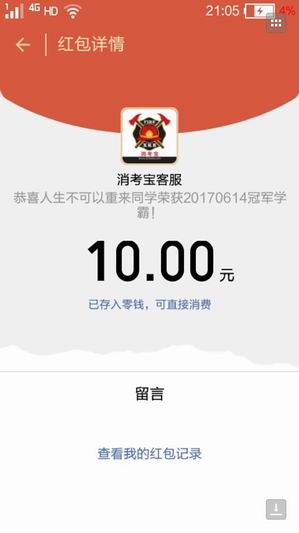 消考宝学霸奖:恭喜"人生不可以重来"同学荣获20170614“冠军学霸奖”!奖金十元。 -考试资讯|消考宝